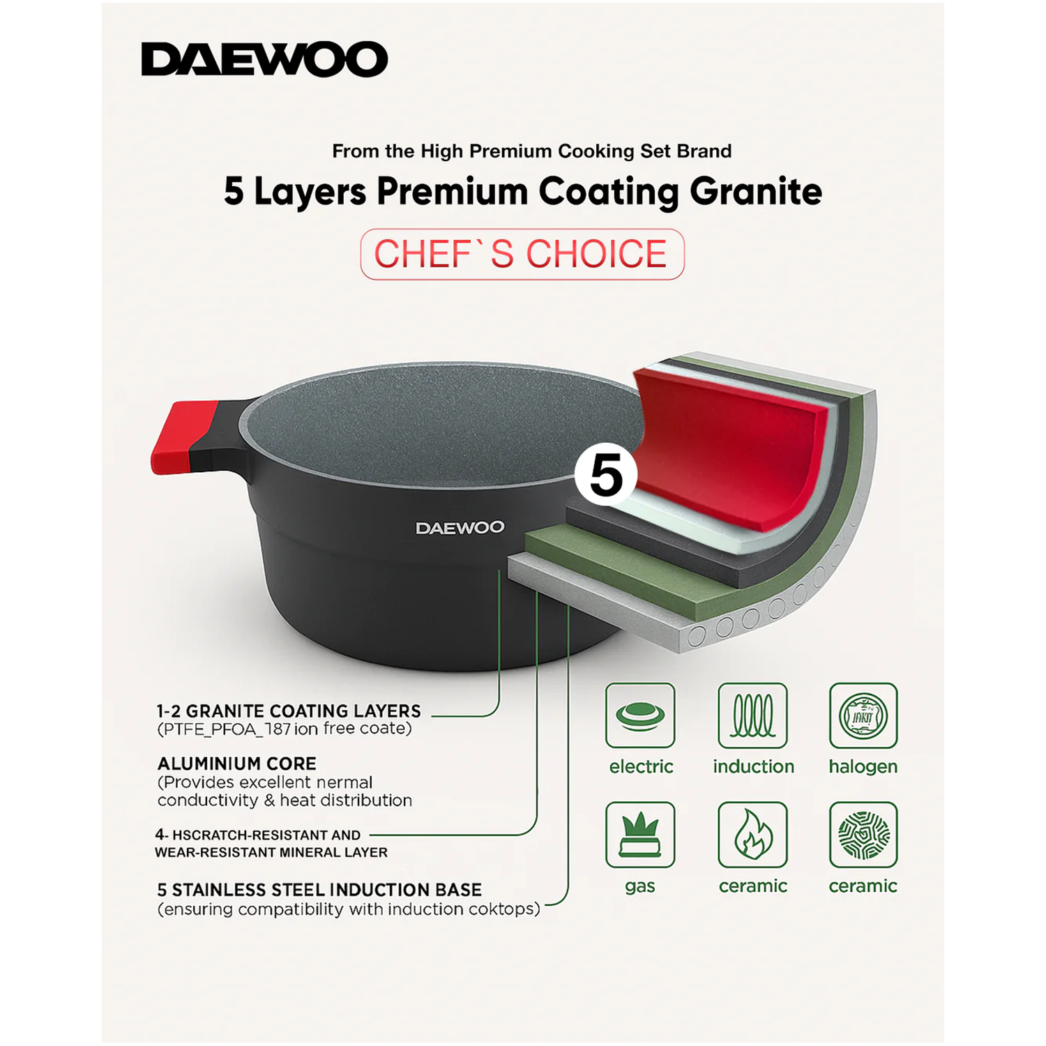 • متوافق مع الموقد: الحث، الغاز، الكهرباء، السيراميك، الهالوجين