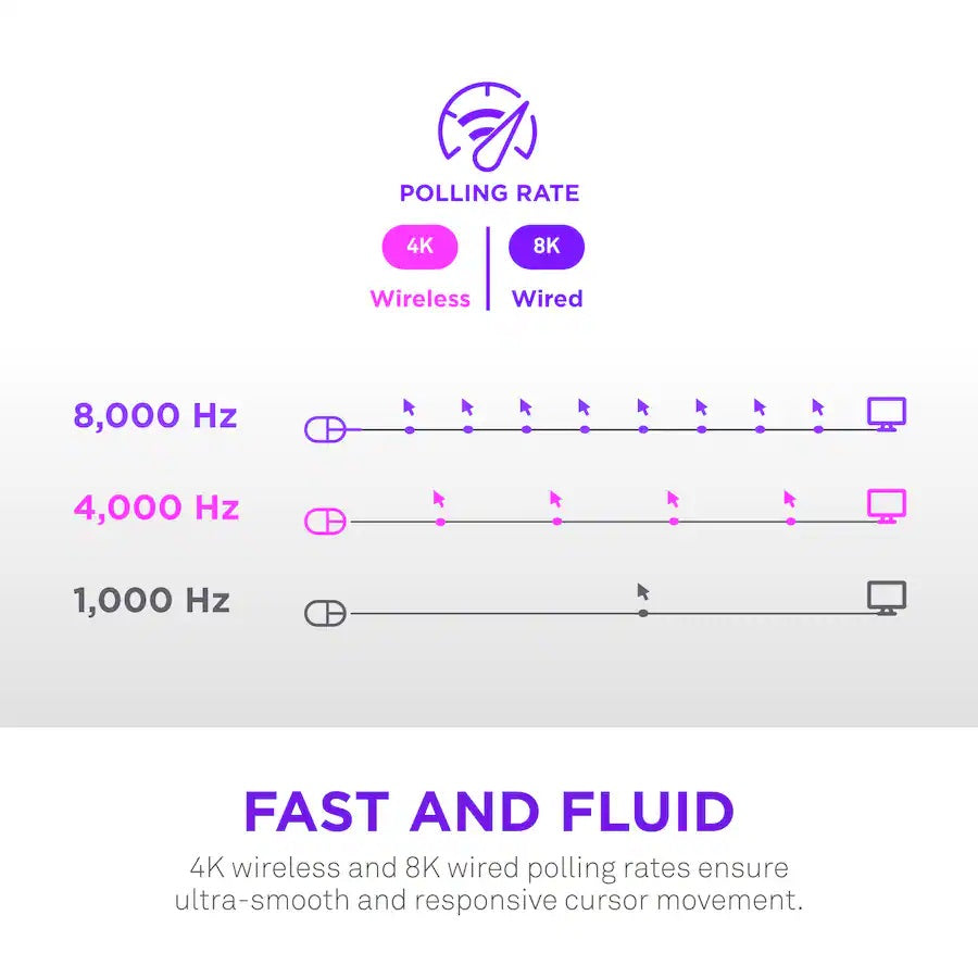 معدلات استدعاء 4K / 8K: حركة مؤشر سلسة وسريعة الاستجابة بمعدلات استدعاء 4,000 هرتز لاسلكيًا و8,000 هرتز سلكيًا، مثالية لشاشات عالية معدل التحديث.