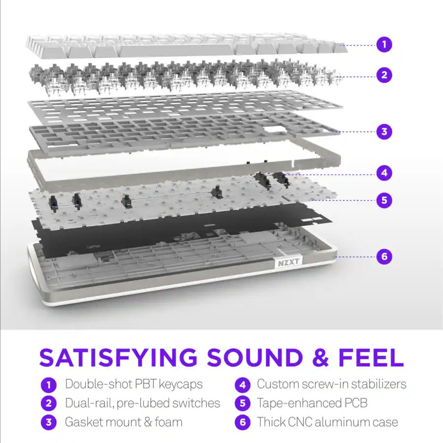مفاتيح NZXT المغناطيسية: حساسات تأثير هول، مغناطيسات قوية، وفيرموير مضبوط بدقة يكتشف كل ضغطة مفتاح بدقة، مما يسمح بتخصيص متقدم للعب والكتابة.
