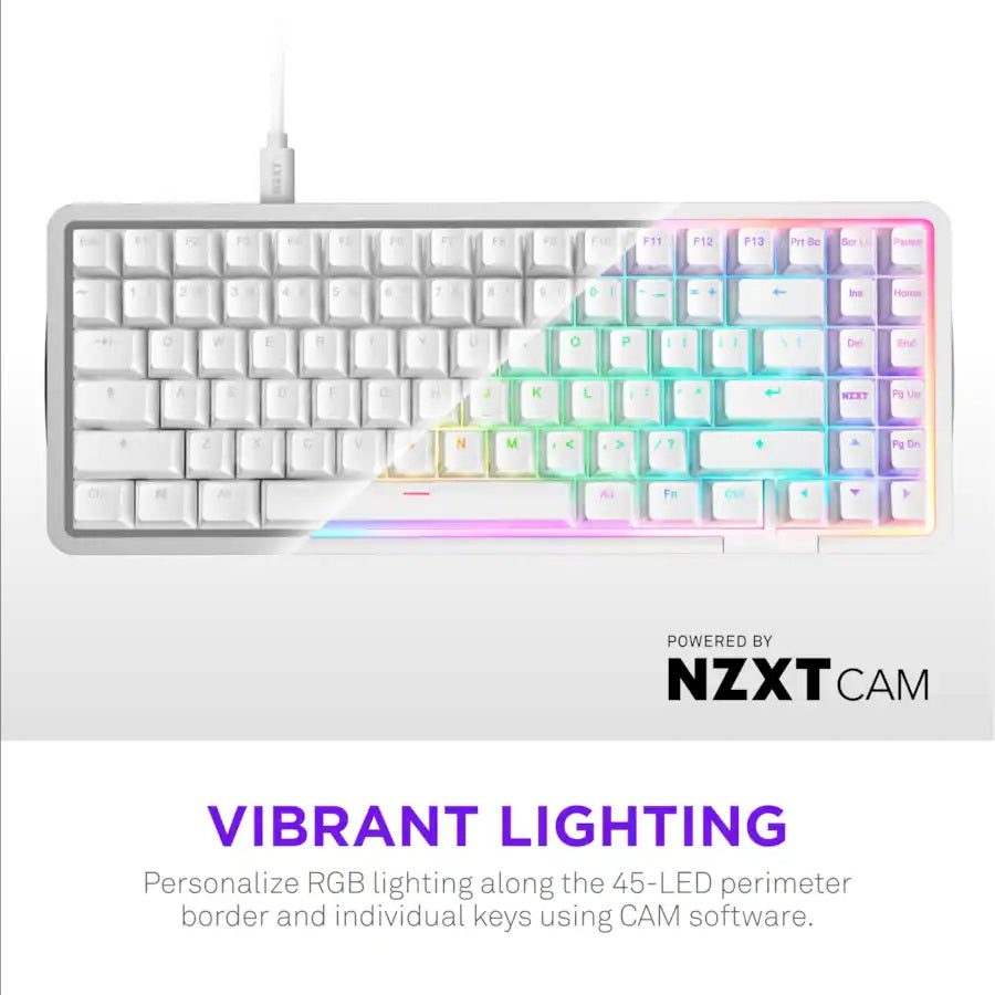 إضاءة نابضة بالحياة: تخصيص إضاءة RGB زاهية على محيط الـ45 LED والمفاتيح الفردية، يمكن التحكم بها بسهولة عبر برنامج NZXT CAM.