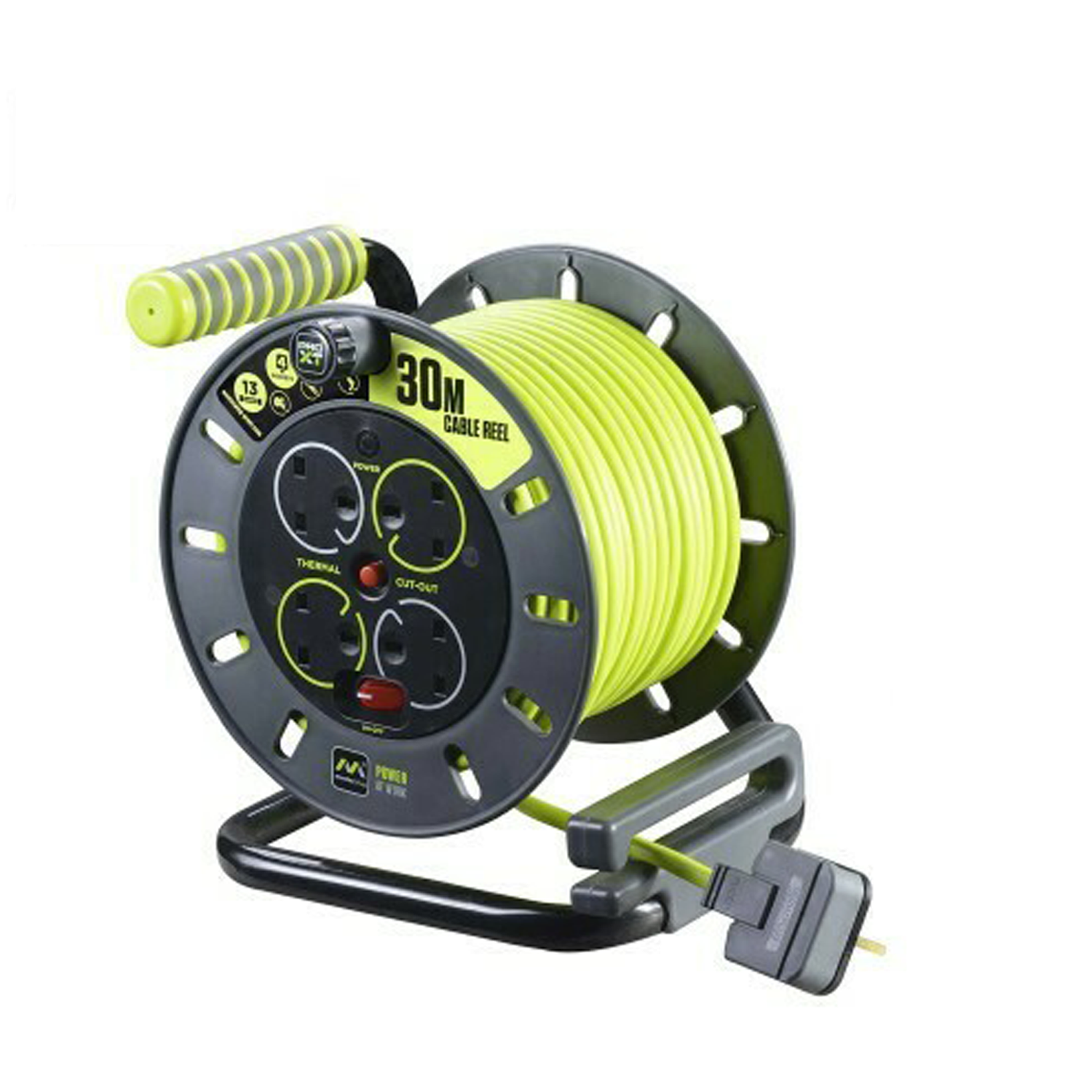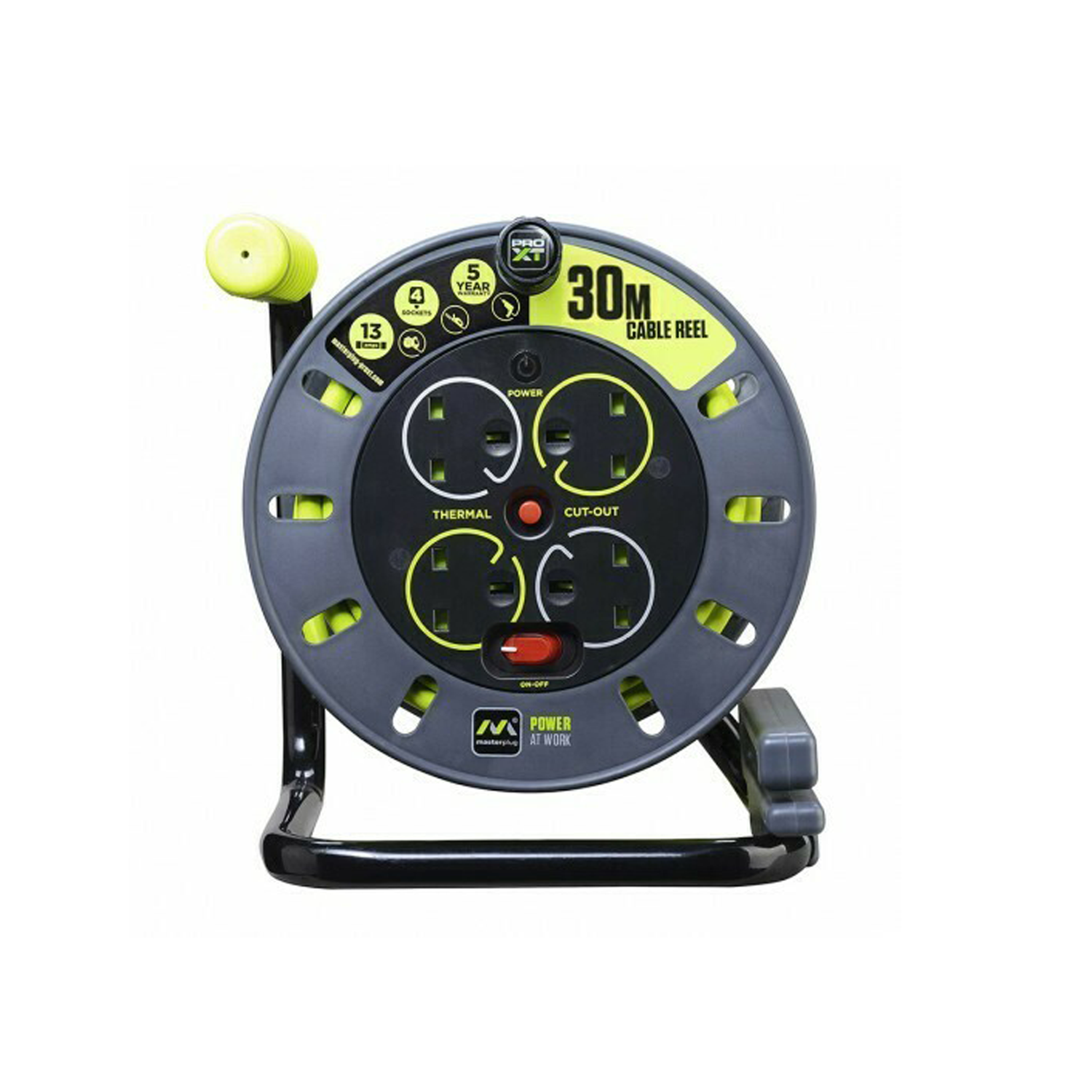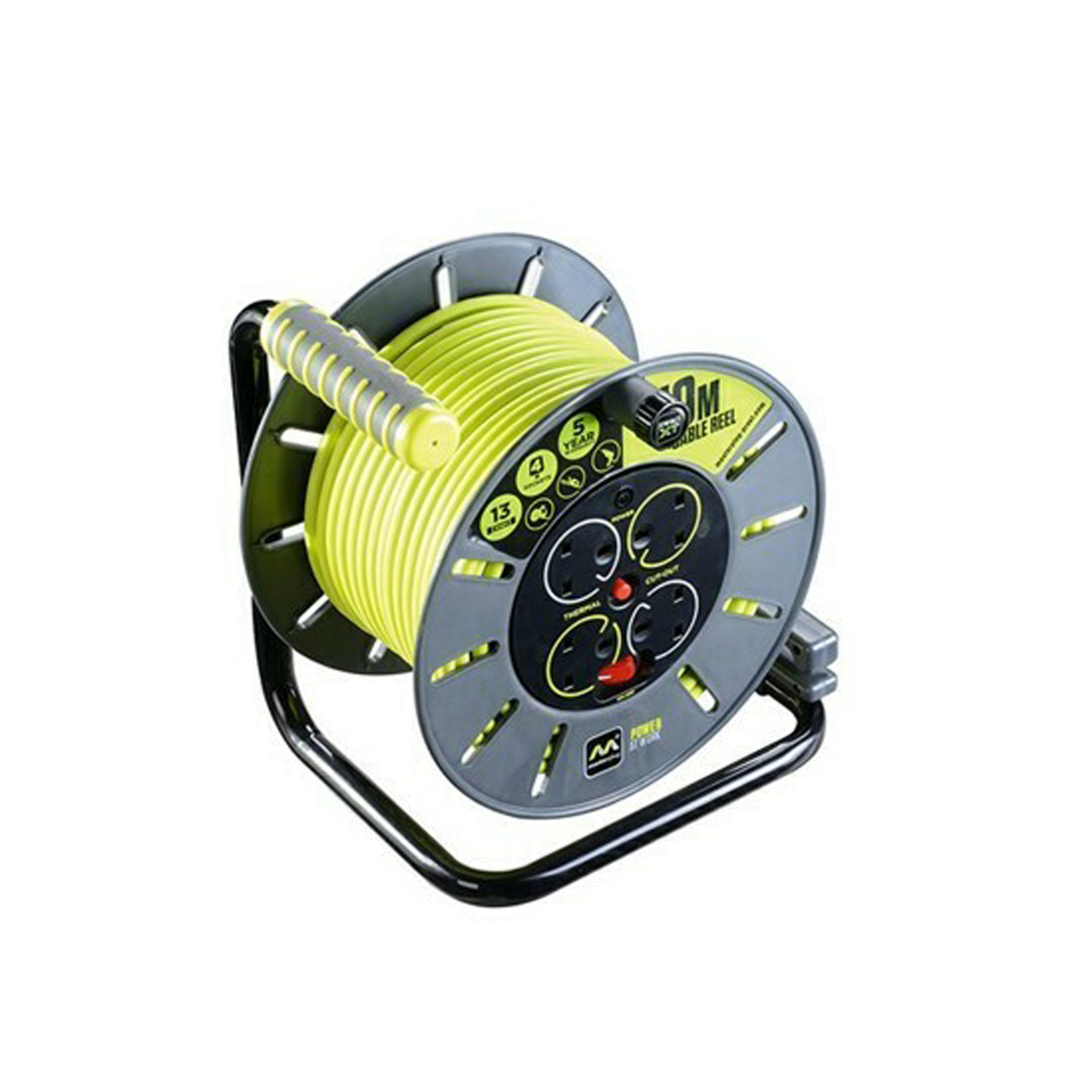 - بكرة مفتوحة متينة مزودة بأربع مقابس مزودة بواقيات أمان