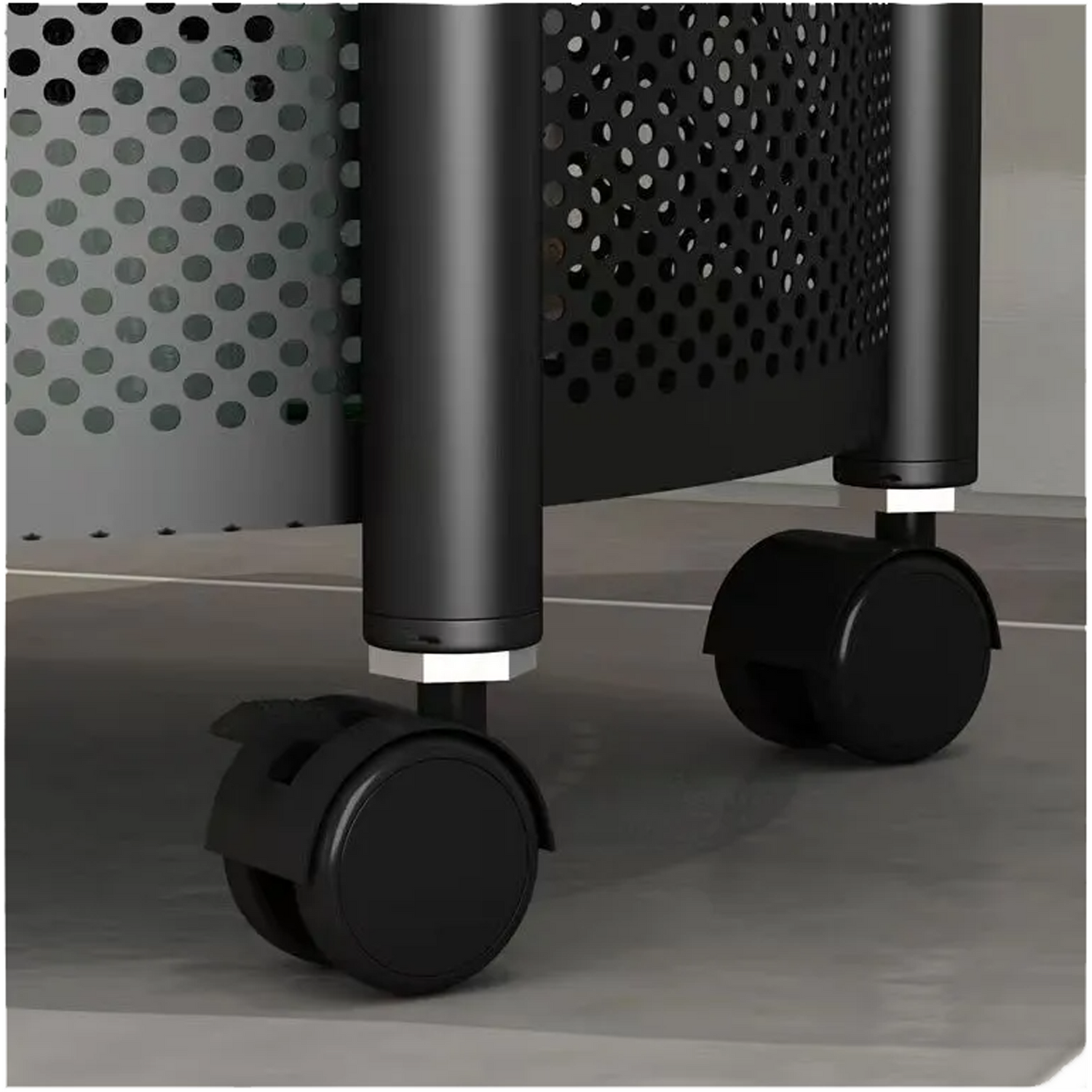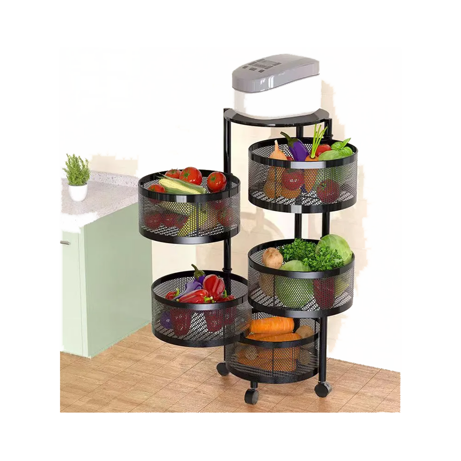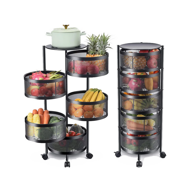 - رف تخزين معدني دائري متعدد الطبقات للمطبخ مع أرفف دوارة وعجلات.