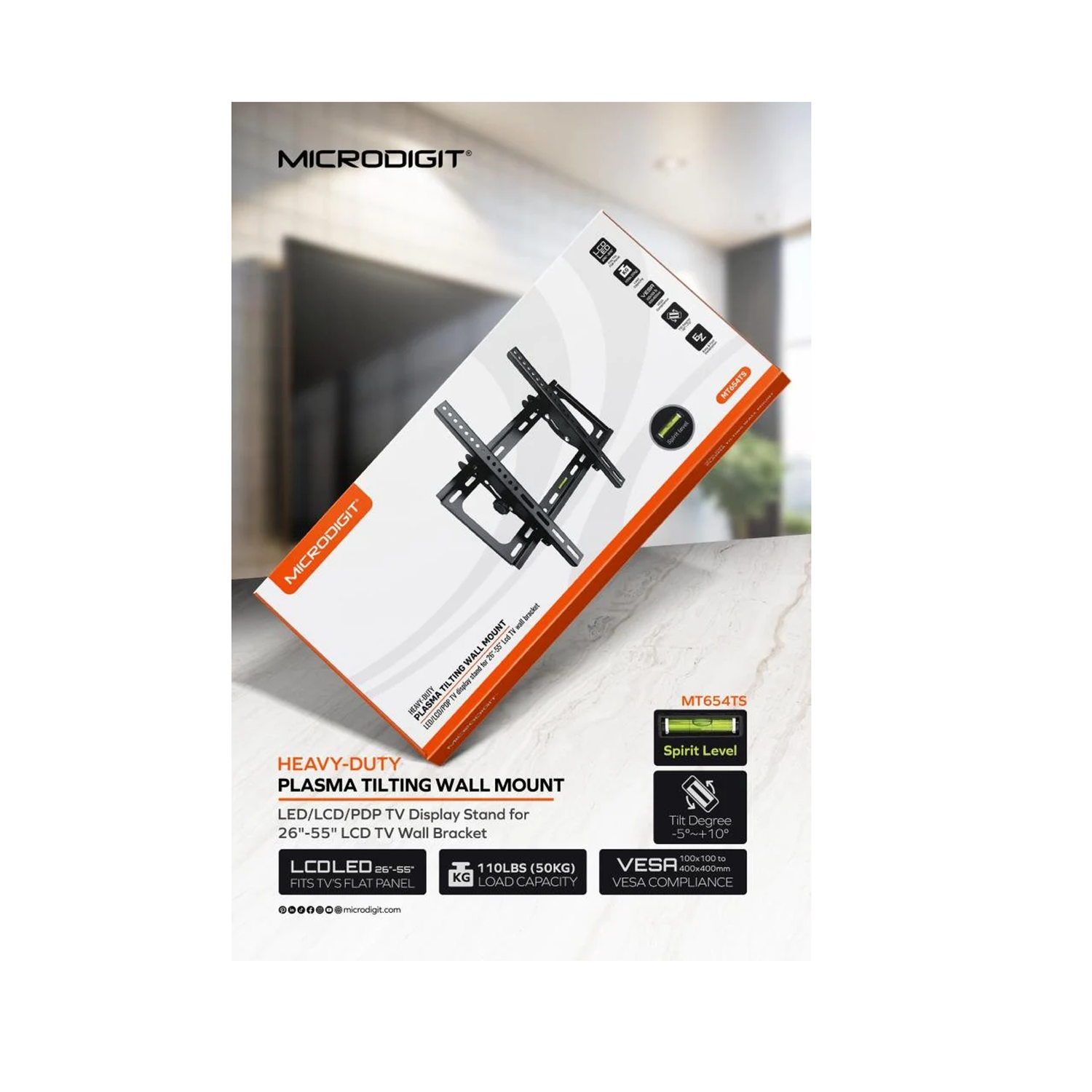 - الخامة: فولاذ مدرفل على البارد عالي الجودة، مناسب لمعظم شاشات التلفزيون المسطحة مقاس 26 إلى 55 بوصة