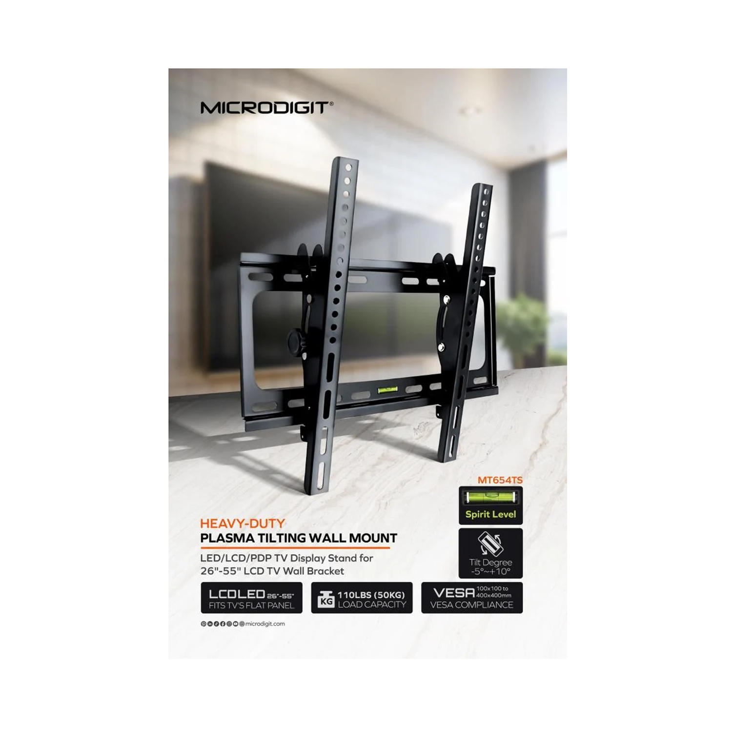 - التوافق: مناسب لأنماط التثبيت حتى 400×400 مم، ويدعم الشاشات المسطحة حتى وزن 50 كجم / 110 رطل