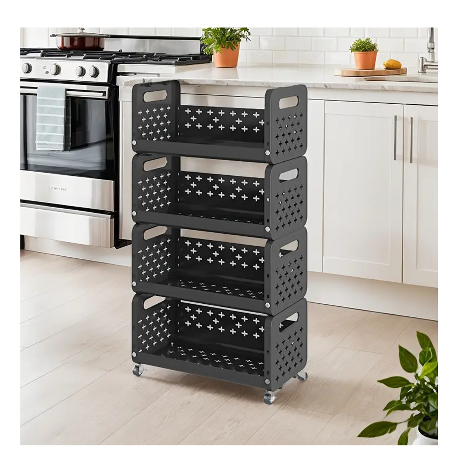 رف تخزين متعدد الاستخدامات بعجلات، اربع طبقات، للأطعمة، الخضروات، الوجبات الخفيفة، أدوات التجميل، ولوازم الحمام – اسود