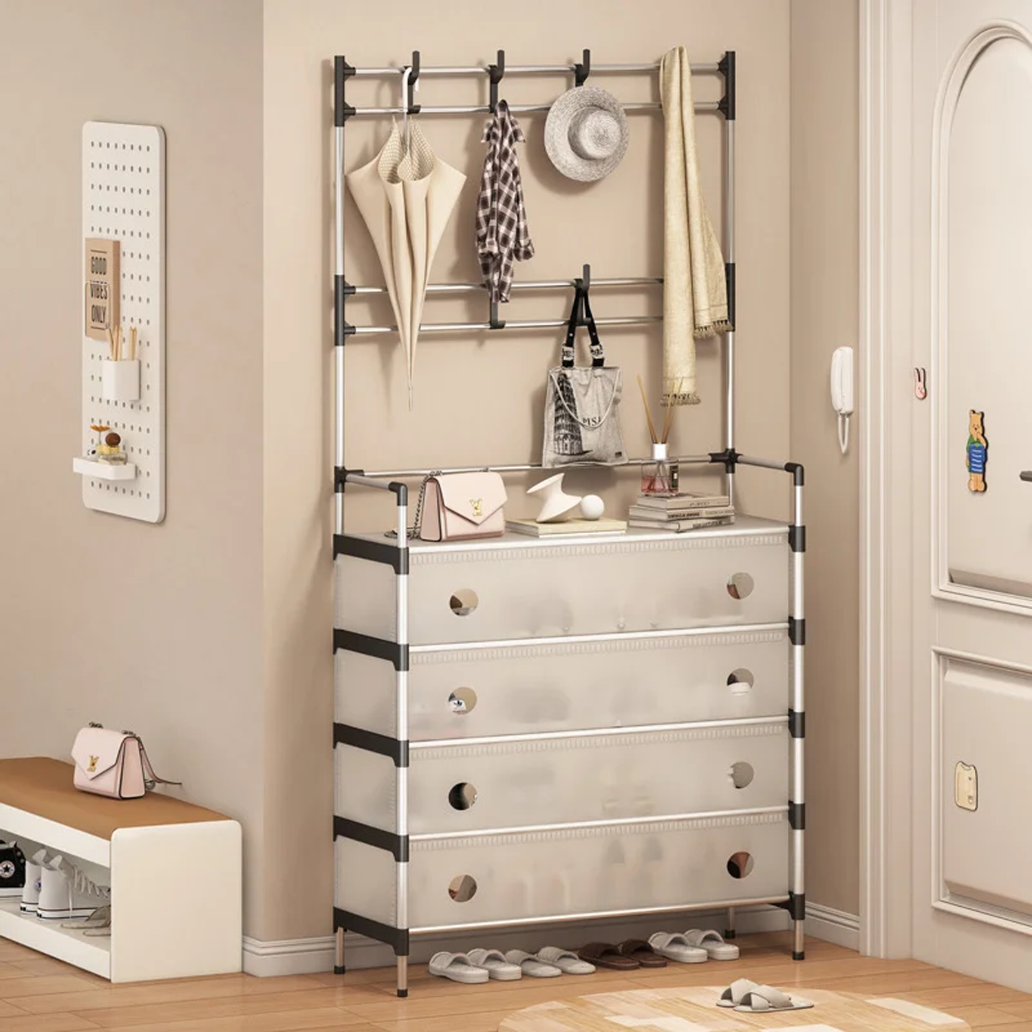 متعددة الوظائف: تحتوي على 8 خطافات علوية لتعليق الحقائب، والمظلات، والمفاتيح، والأوشحة، وغيرها. الجزء السفلي يضم 5 أرفف مثالية لتخزين الأحذية.
