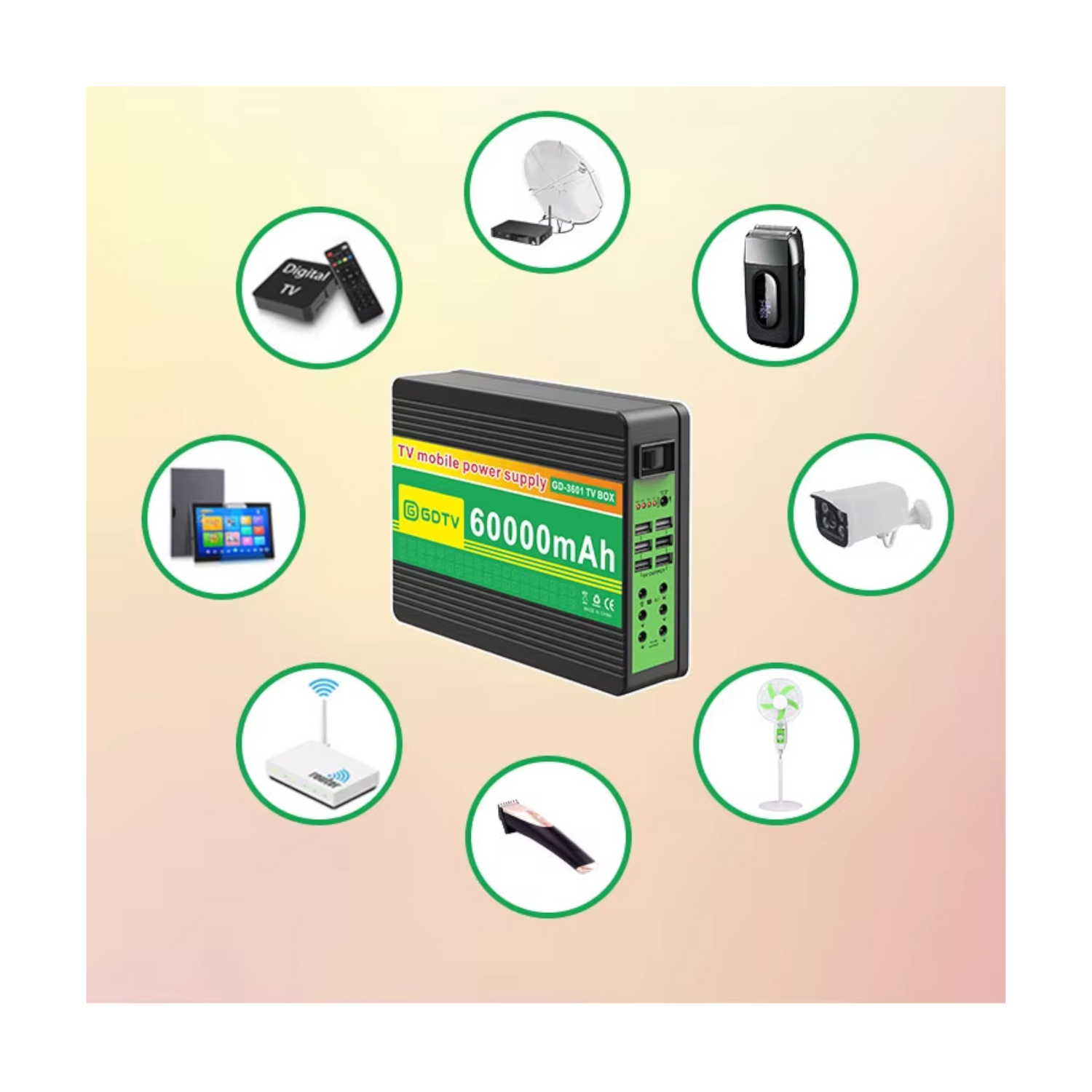 The 60,000 mAh high-quality battery supports 12V DC and 5V output, ensuring long-lasting performance. Designed for harsh environments, this IP67 waterproof TV works efficiently in various weather conditions, making it ideal for rural areas, outdoor setups, and backup power solutions.