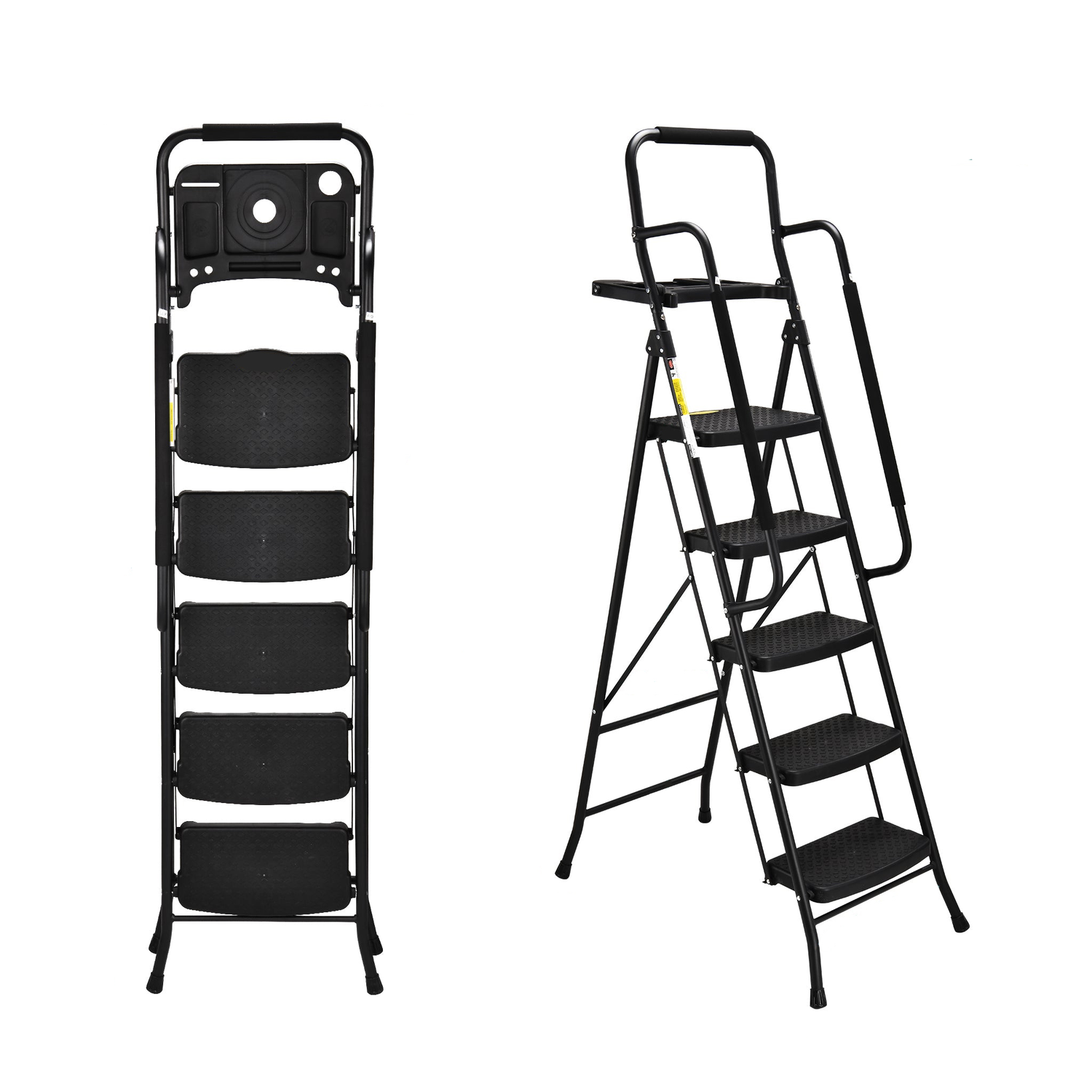 - Sturdy 5-step ladder with handrails and a built-in tool platform