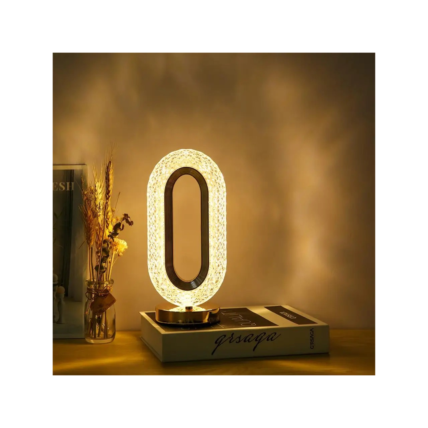 - Incredibly stunning in its grandeur, this table lamp flaunts a shade made of textured acrylic that resembles glass crystal.