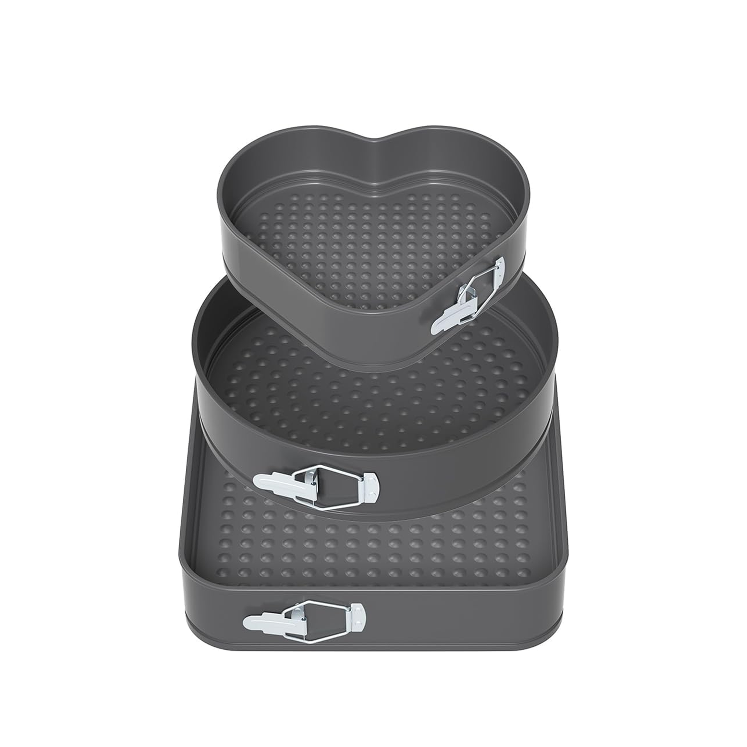 - Set of 3 spring form pans includes 3 different shapes for versatility